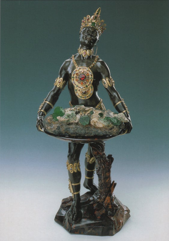 Und schließlich: Was tut der Mohrenfürst genau? Steht er da und zeigt seinen Reichtum? Und warum sollte ein „Mohrenfürst“ überhaupt so etwas tun? Dieses Motiv klärt sich, wenn man weiß, dass es sich bei der Smaragdstufe um ein Geschenk von Rudolf II. handelt. Der Mohr präsentiert also nicht einfach seinen Reichtum, er überreicht ihn dem europäischen Fürsten.
